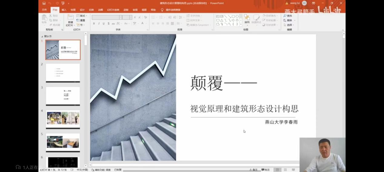 12月12日晚6点30分,“通观”——基础教学部系列学术线上讲座第一百二十期《视觉原理和建筑形态构思》顺利举办。本次讲座由燕山大学建筑工程与力学学院讲师李春雨主讲,基础教学部全体学生认真观看了讲座。