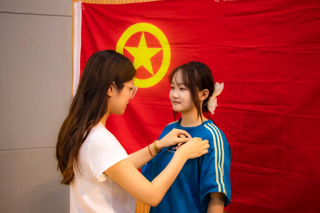 徐茜娅老师为新发展团员颁发团员证、佩戴团徽,并勉励新团员要胸怀远大理想,扛起时代重任,锤炼坚毅品格,争做优秀共青团员。