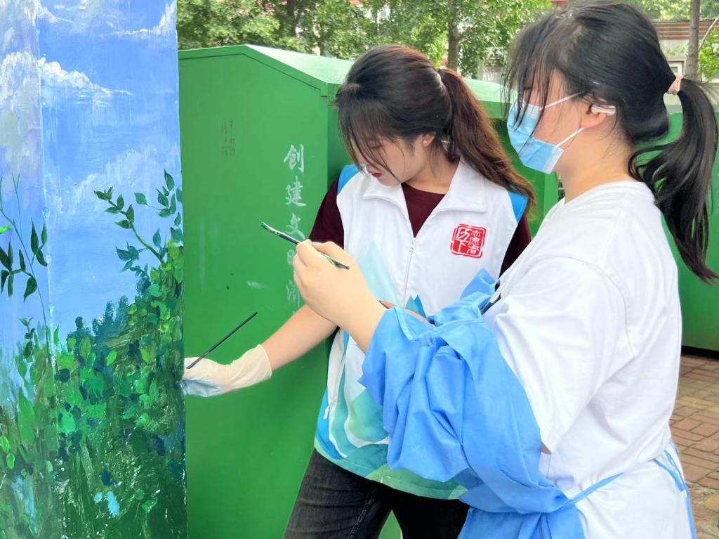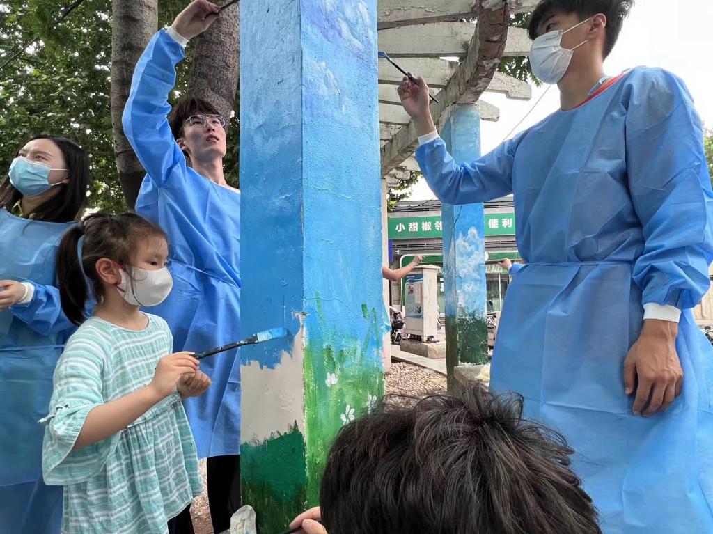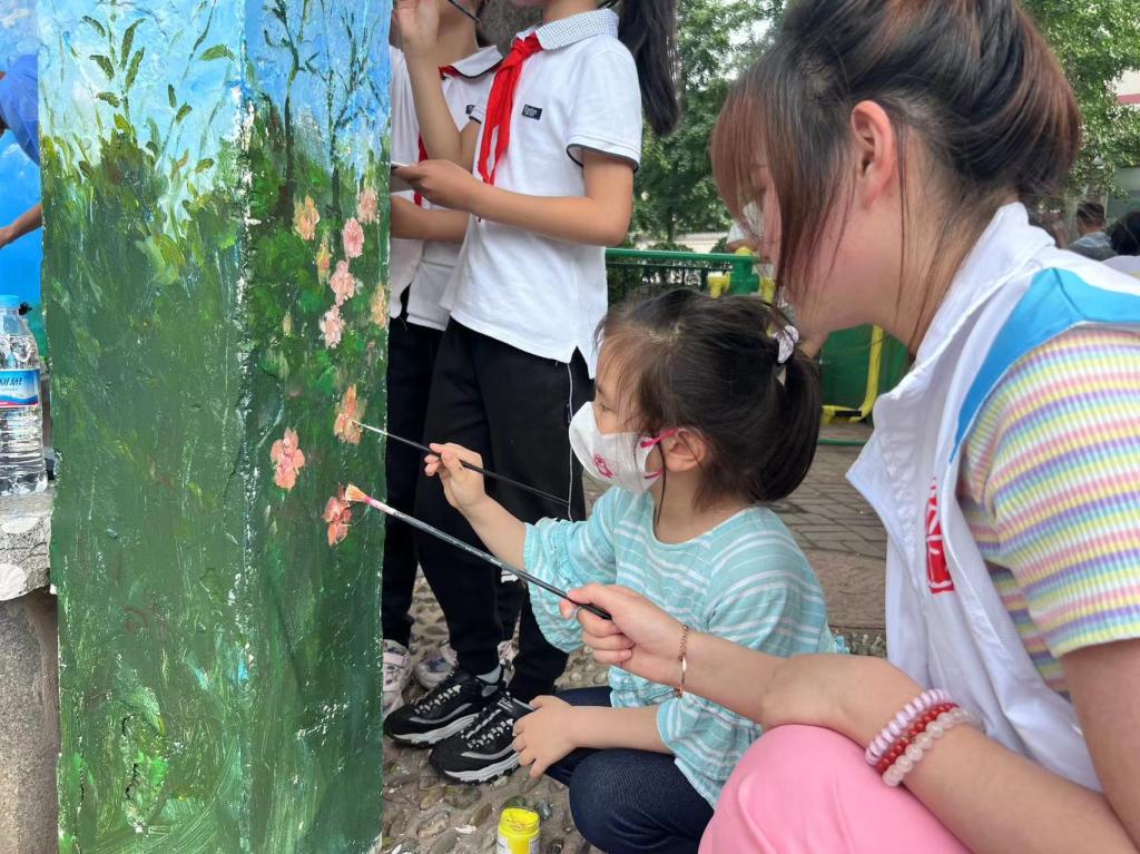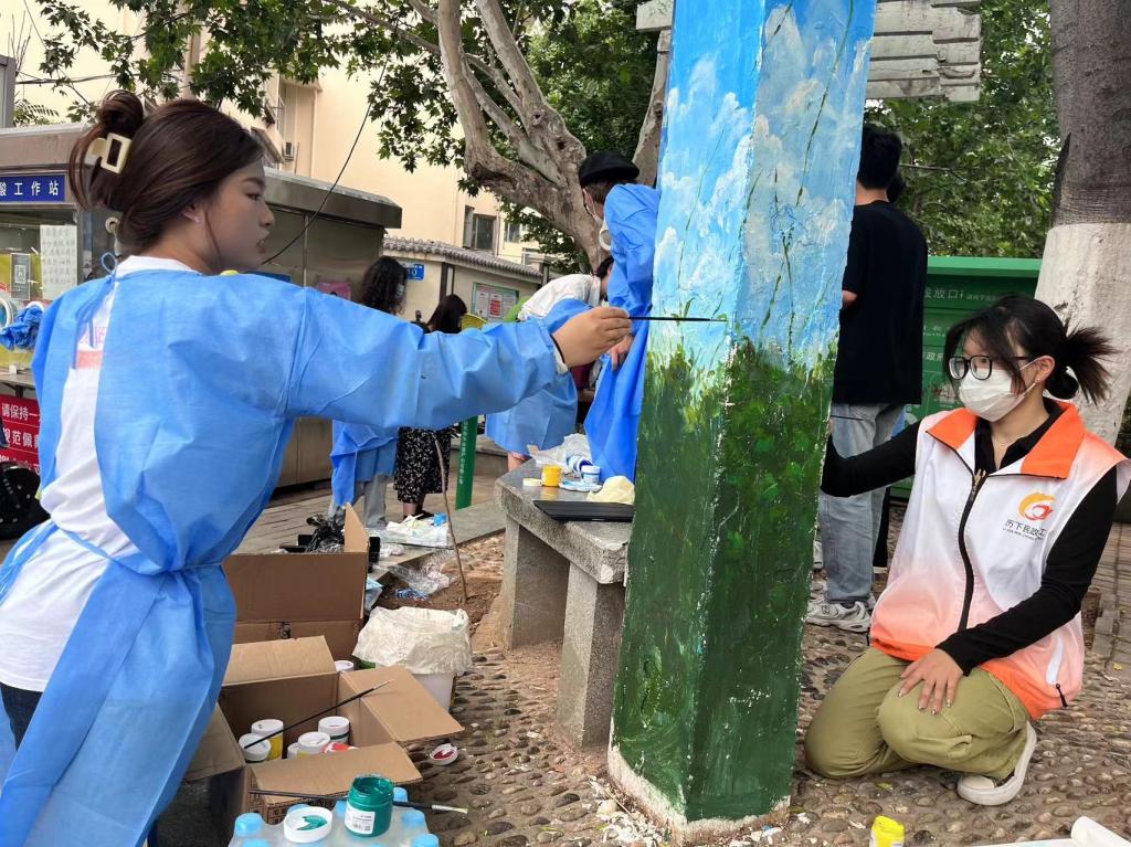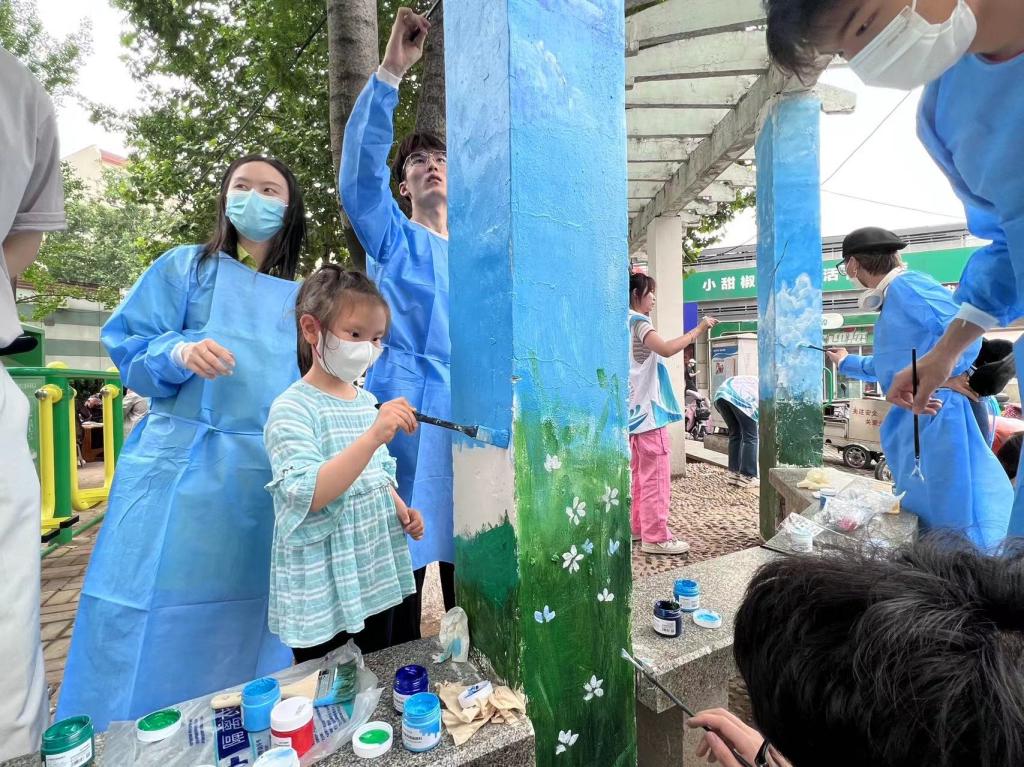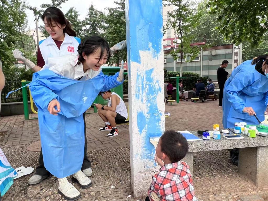 团员青年们热情高涨,共同完成墙面清理、刷底、起稿、弹线、上色等工作,期间有许多社区居民和小朋友前来观看,希望通过此次活动让更多的小朋友爱上绘画,遇见不一样的人生。