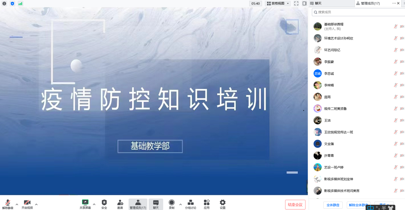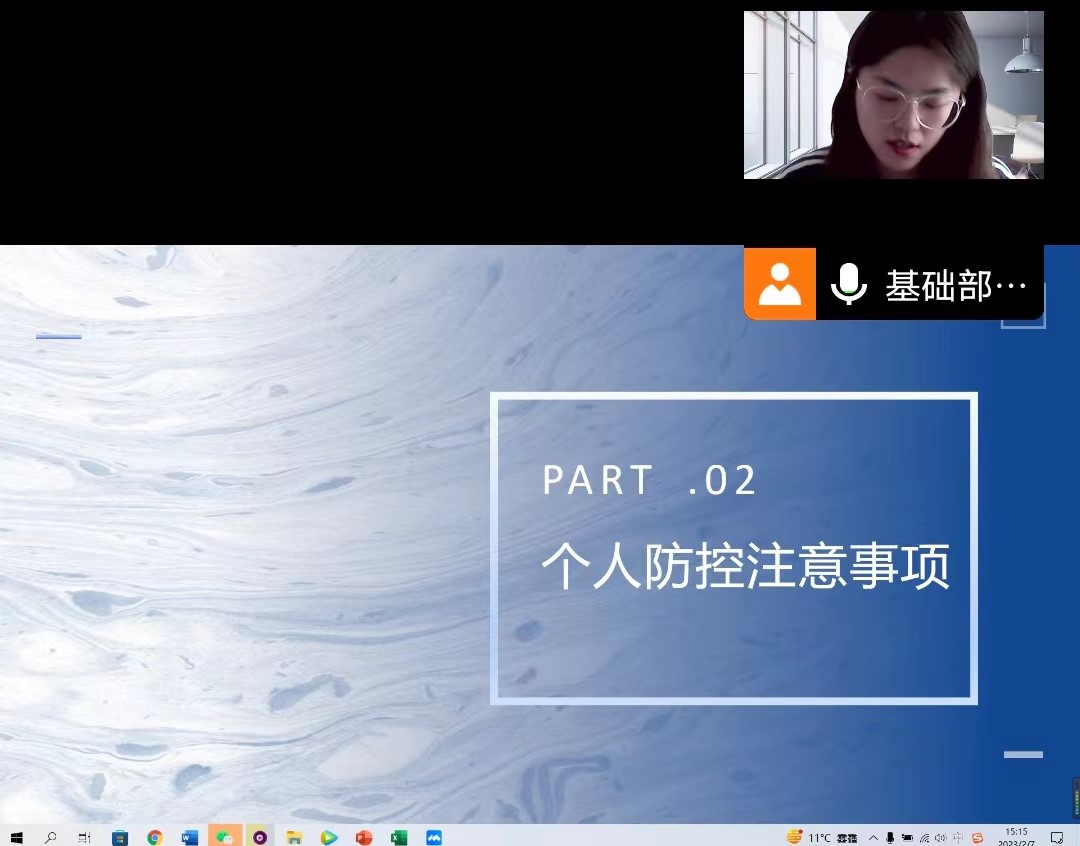 为全面做好2023春季学期疫情防控相关工作,落实新型冠状病毒“乙类乙管”下学校疫情防控各项举措,普及疫情防控知识,提高学生的安全意识,2023年2月7日基础教学部召开疫情防控知识培训会议。会议由基础教学部辅导员徐茜娅主持,党委直属党支部书记李忠诚出席,基础教学部各班级负责人参加。