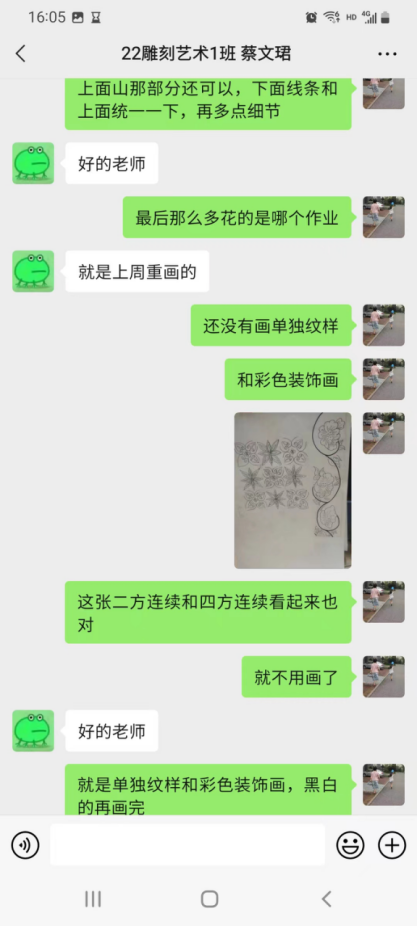 通过课堂点名进行互动;课堂连线学生拍摄作业进行作业的讲评,与每位同学进行沟通指导。课下用微信与学生沟通辅导作业。