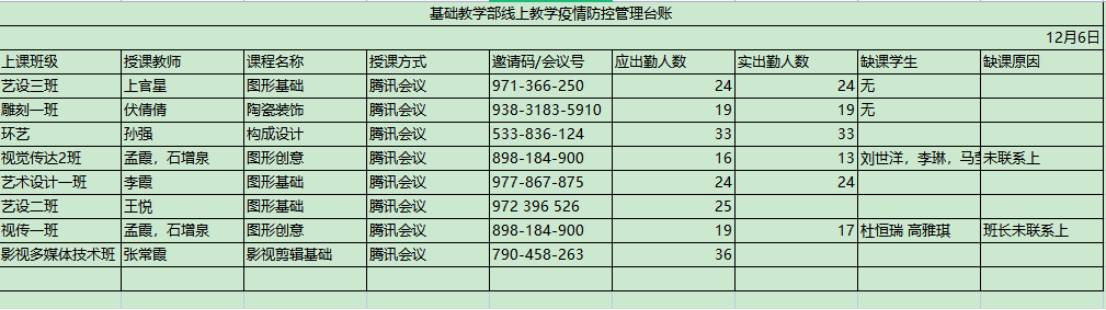 自12月5日以来,基础教学部线上专业课程9门,线上教师授课人数9人,应到课学生218人,实际到课203人,平均到课率93.12%,经核查大部分未到课的学生因正在返乡缘故。