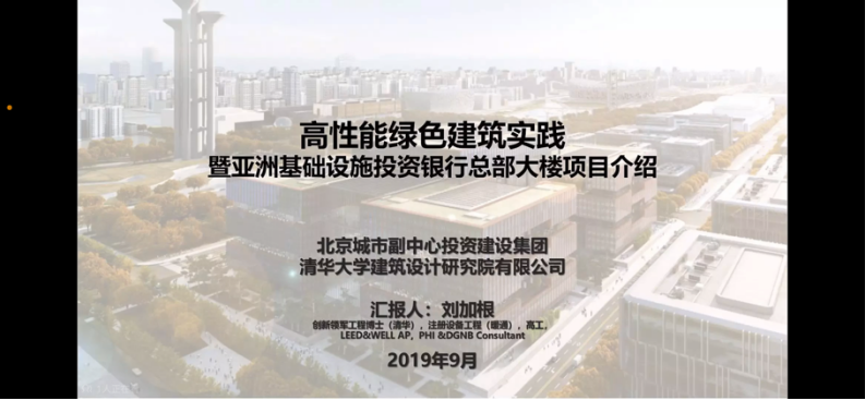 结合个人工作历程与学习经验,刘加根老师以亚洲基础设施投资银行总部大楼项目为例,深入浅出地讲解了工作概况、工程定位与建设目标、绿色关键技术体系、十二项示范性关键绿色技术、向健康建筑示范项目的转变等五个方面的专题内容,充分展示了绿色、生态、低碳的建筑设计范例,体现了以人为本,与自然和谐共存的设计艺术理念。