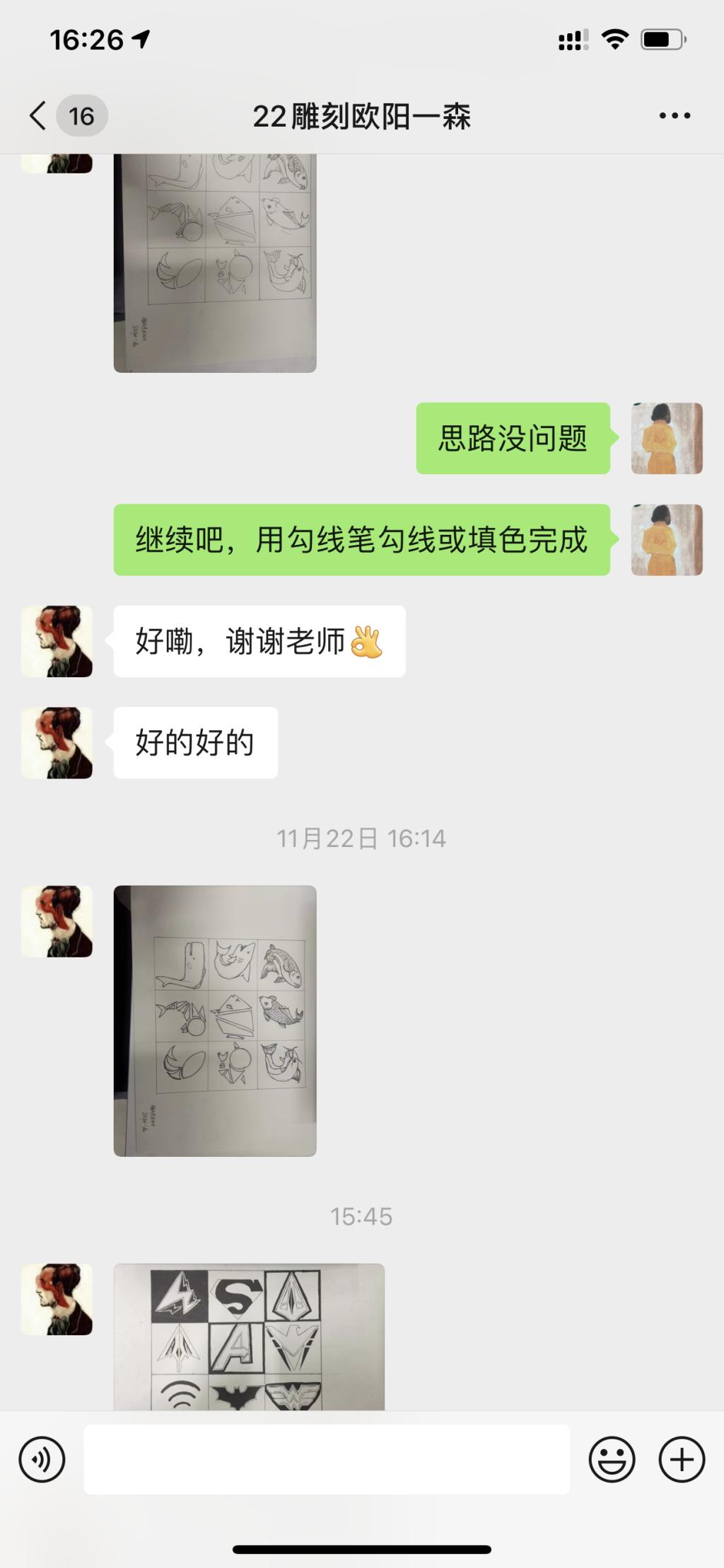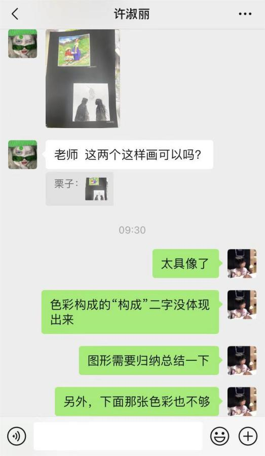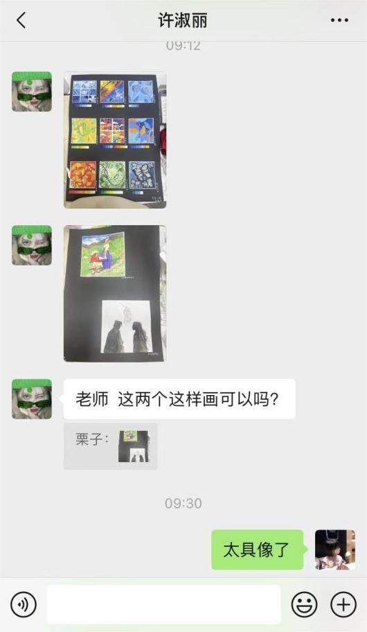 通过课堂点名进行互动;课堂连线学生拍摄作业进行作业的讲评,与每位同学进行沟通指导。课下用微信与学生沟通辅导作业。