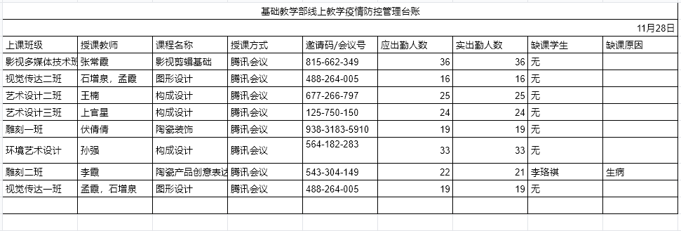 自11月28日以来,基础教学部线上专业课程9门,线上教师授课人数9人,应到课学生218人,实际到课217人,平均到课率99.54%。