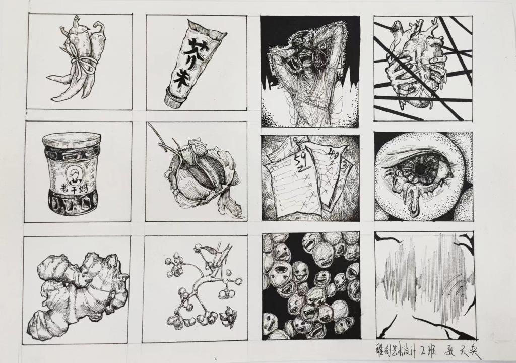 4,当日作业布置:①10ⅹ10cm方格X9个,以点线面为源图形进行组合,以自然环境和城市环境为素材,完成点线面的黑白画。②视频讲解作业过程。③明天点名汇报展示。→结合上周作业PPT。
