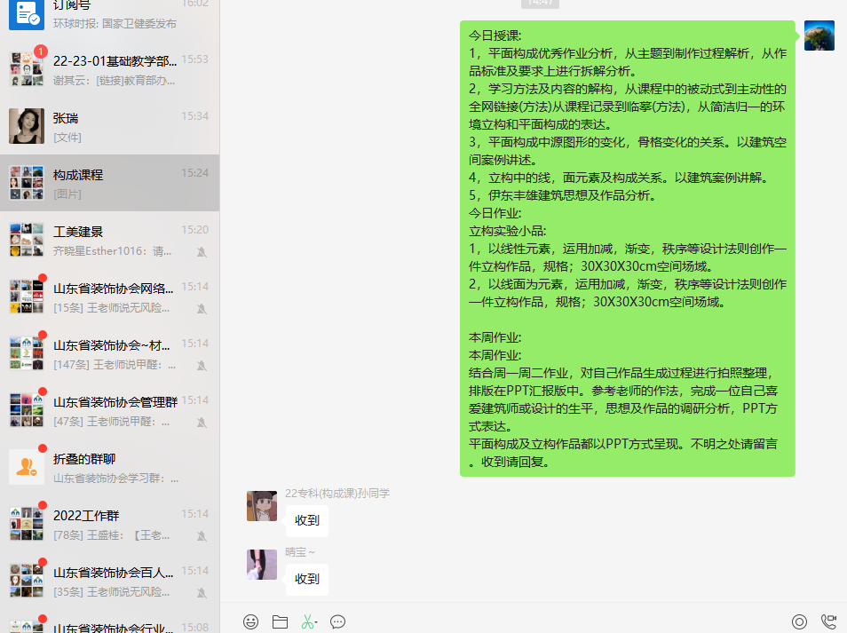 教师孙强为22级环境艺术设计班授课,课程名称为《平面构成》,通过腾讯课堂直播平台,微信群资讯共享。