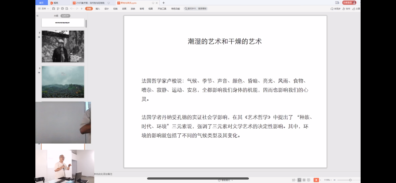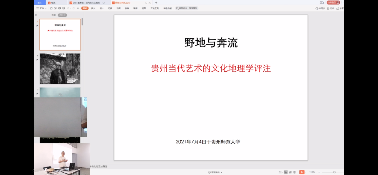 2022年10月25日晚6点30分,“通观”——基础教学部系列学术线上讲座第五十二期《野地与奔流-贵州当代艺术的文化地理学评注》顺利举行,讲座由云南大学艺术与设计学院美术系,中央民族大学汉语系汉语言文学教授管郁达主讲。基础教学部全体学生认真观看了本次讲座。