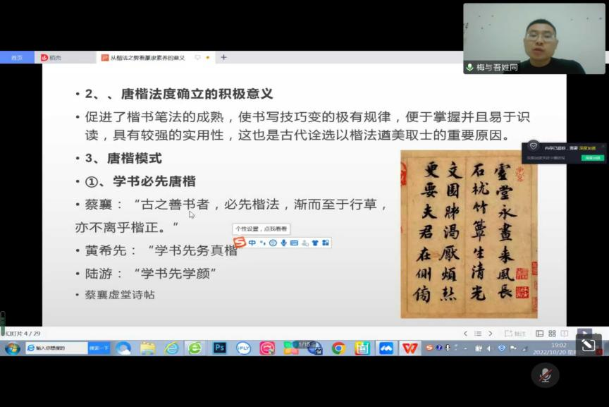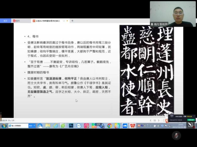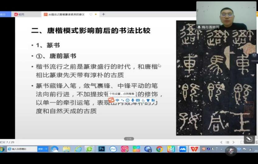2022年10月20日晚7点,“通观”——基础教学部系列学术线上讲座第五十一期《从楷法之弊看篆隶素养的重要意义》顺利举行,讲座由中国国家画院书法篆刻所专职艺术家、书法篆刻专业委员会研究员,中国书法家协会会员梅跃辉博士主讲,基础教学部主任谢其云主持。基础教学部全体学生认真观看了本次讲座。
