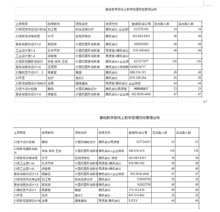 基础教学部每日制作基础教学部线上教学疫情防控管理台账,并要求授课教师每日提交授课过程照片,每周提交线上教学总结,及时掌握线上教学情况。