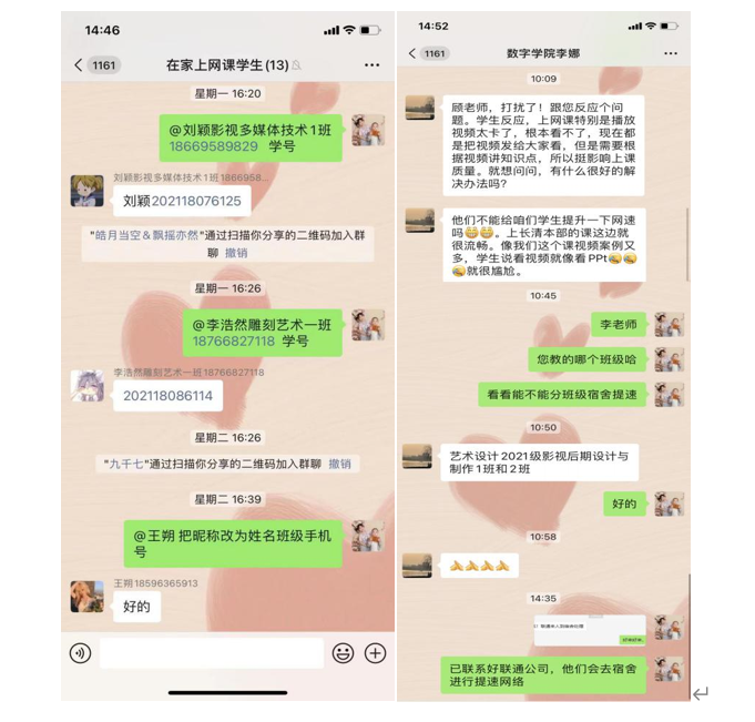 针对不在校、在家上网课的学生建立微信联络群,方便了解其上网课情况,进行随时沟通,同时为下一步线下教学做准备;针对老师提出的线上教学需解决的问题,积极配合并解决问题,保障线上教学有序稳定开展。