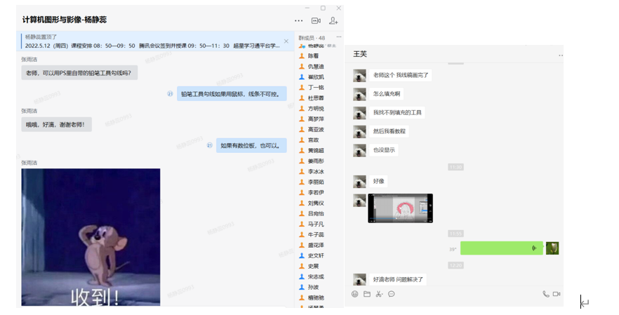 本周同学们一方面通过超星学习通的spoc课程学习PS软件的基本操作技能,并完成服装插画的设计;一方面教师根据同学们的作业完成情况,通过腾讯会议直播的形式示范一些操作重点和难点,并针对性地讲解学生在操作过程中遇到典型问题;在这个过程中,教师再通过群内答疑与单独辅导相结合的形式进行教学指导。