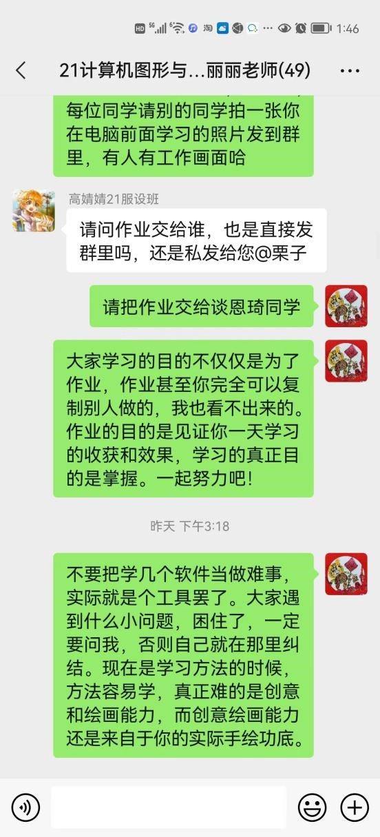 为防止网络授课模式,学生易产生倦怠情绪和或者不会有效安排学习时间,课上针对学生的练习要求做到具体化和细致化,即使不是与最终成绩相关的每一个练习都要在当天上交。另外,对学生以鼓励为主,如果学生没有学会操作方法,那就反复给学生演示,直到学生明白为止。