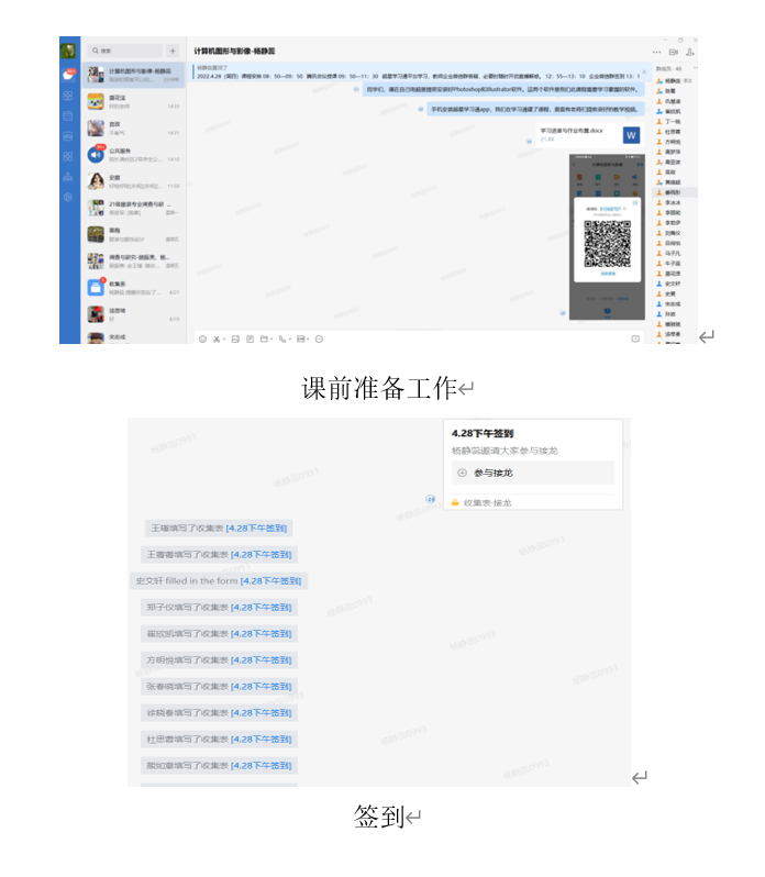 师生互动情况:线上教学跨越了时间空间限制,在软件实践过程中同学们随时通过微信群或微信私信联系,老师随时讲解。同时,利用雨课堂随机点名功能,课上随时与学生互动提问,增强学生的课堂参与度和积极性。
