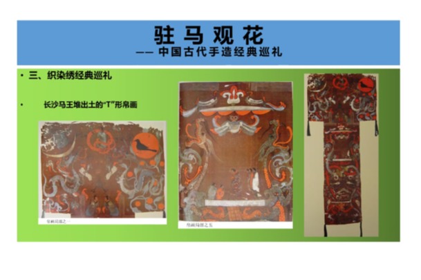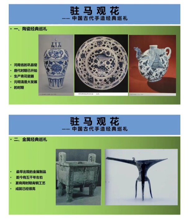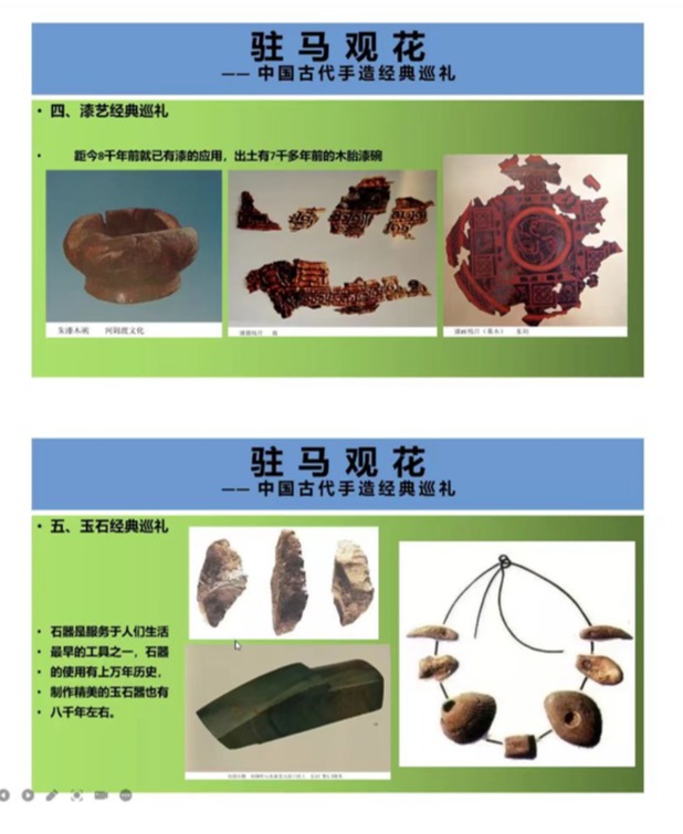 徐思民教授首先从大家关注的热词“山东手造”谈起,向大家讲述了手造的概念、手造与中国古代工艺美术的关系、传统手造的当代意义以及我校关于传统手造的教育理念。随后他以时间为主线,从美术考古的视角为同学们详细梳理了中国古代陶瓷、金属、织染、漆器、玉石等手工艺术创作辉煌灿烂的发展历程。陶瓷工艺方面他着重介绍了唐三彩,宋代单色瓷、青花瓷等经典陶瓷作品,简要讲解了陶瓷工艺流程及其他相关知识;金属工艺方面他重点讲解了青铜器、金器及其实用功能,展示了长信宫灯、虢季子白盘等大量经典文物;织染工艺方面则着重品鉴了古代服饰花纹图案,展示了素纱禅衣、“T”形帛画等优秀文物……。最后,徐思民教授鼓励大家放宽阅读视野和学习路径,精益求精,不断提高专业素养和知识储备,自觉将山东手造精神和创新意识融入自己的学习过程。