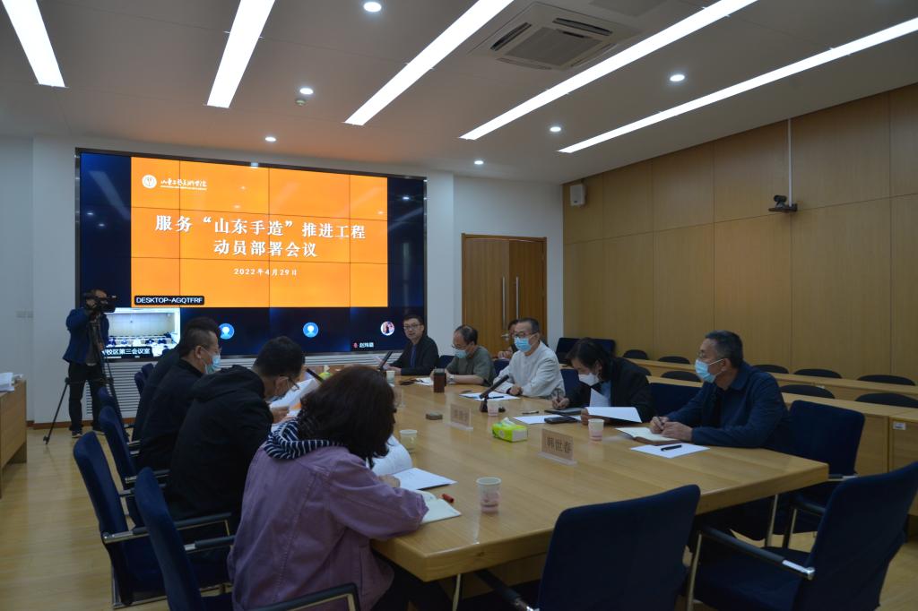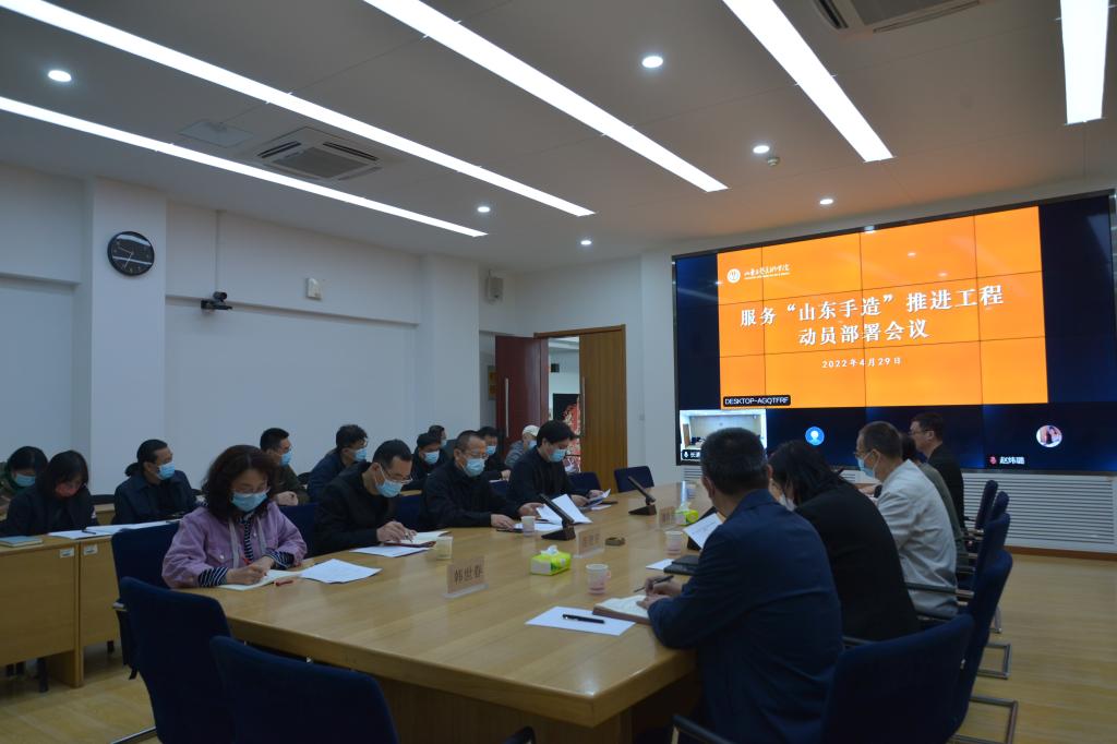 为认真贯彻落实省委常委、宣传部部长白玉刚在“山东手造”推进工程视频会议上的讲话精神和《“山东手造”推进工程实施方案》工作要求。4月29日上午,学校在长清校区第三会议室召开服务“山东手造”推进工程动员部署会。党委书记何思清,院长潘鲁生,党委副书记苗登宇,副院长张艳霞,纪委书记苗新民,副院长董占军、韩世春,党委委员、统战部部长孙大刚,党委委员、宣传部部长韩文涛,党委委员、组织部部长许磊出席会议,会议由苗登宇主持。因疫情防控需要,会议采取线上线下相结合的方式举行。