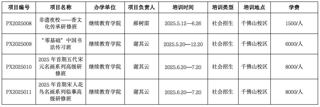 根据教育部《普通高等学校举办非学历教育管理规定(试行)》(教职成厅函〔2021〕23号)及《2025新澳门免费原料大全非学历教育管理办法(试行)》(鲁工美院办字〔2024〕7 号)等文件要求,继续教育学院申报的“非遗夜校——香文化传承研修班”等4个非学历教育培训班经所在单位论证,主管部门审核,校领导审批,予以立项举办。现将信息公示如下: