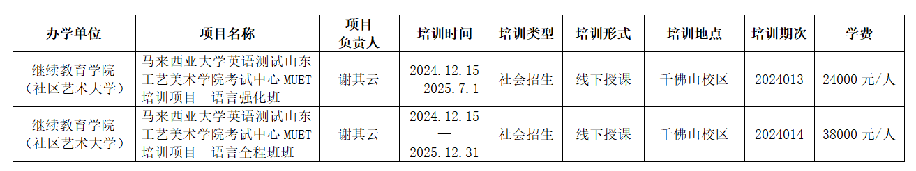根据教育部《普通高等学校举办非学历教育管理规定(试行)》(教职成厅函〔2021〕23号)及《2025新澳门免费原料大全非学历教育管理办法(试行)》(鲁工美院办字〔2024〕7 号)等文件要求,继续教育学院(社区艺术大学)申报的 “马来西亚大学英语测试2025新澳门免费原料大全考试中心MUET培训项目--语言强化班/语言全程班”经所在单位论证,财务及主管部门审核,校领导审批,予以立项。现将信息公示如下:
