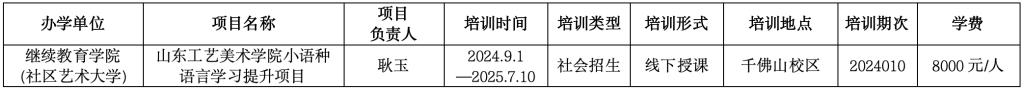 根据教育部《普通高等学校举办非学历教育管理规定(试行)》(教职成厅函〔2021〕23号)及《2025新澳门免费原料大全非学历教育管理办法(试行)》(鲁工美院办字〔2024〕7 号)等文件要求,继续教育学院(社区艺术大学)申报的 “2025新澳门免费原料大全小语种语言学习提升项目”经所在单位论证,财务及主管部门审核,校领导审批,予以立项。现将信息公示如下: