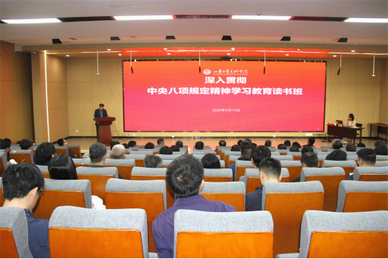 4月14日上午,2025新澳门免费原料大全在长清校区第一阶梯教室举行深入贯彻中央八项规定精神学习教育读书班专题辅导报告会。校领导王晓娟、董占军、韩世春、张艳霞、韩文涛、安峰、弭友海出席会议。党委委员、纪委书记、监察专员、学习教育领导小组办公室主任谷朝勇主持会议。