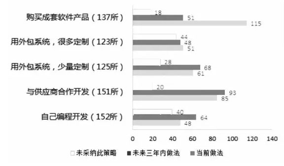 多数院校以购买成套软件产品为主,而在未来三年内则会倾向于外包、合作开发和自行开发三分天下。