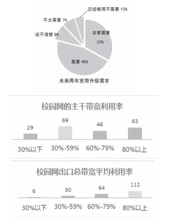 从校园网主干带宽利用率来看,校园网的整体使用率较高,出口带宽尤其需要扩容,将近80% 的学校都表示在未来两年内需要升级带宽。