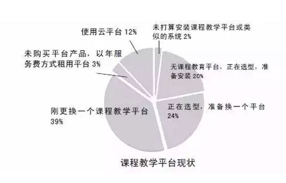 教学是高校的主要工作,教学信息化是管理信息化之后各高校优先发展的业务。各高校多媒体教室已成标配,近80% 的高校采购了全校性网络教学平台。