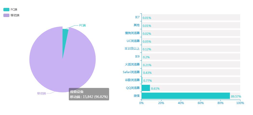 从访问形式来看,两场直播都有超过半数人群通过直接访问的形式收看直播,通过微信朋友圈和微信群两种方式收看的约占收看总数的40%,通过其他形式收看的约占总数的10%,通过移动终端设备观看的超过总数的90%。由此看出,观众更加愿意通过终端设备观看网络直播。