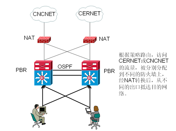 我校长清校区目前仅有网通出口,为使长清校区校园网用户能够快速地访问教育网资源,网络信息管理中心经过一个星期的紧张调试,通过新老校区互联光纤,借助千佛山校区教育网出口,利用策略路由技术,完成我校长清校区校园网教育、网通双出口的负载均衡。