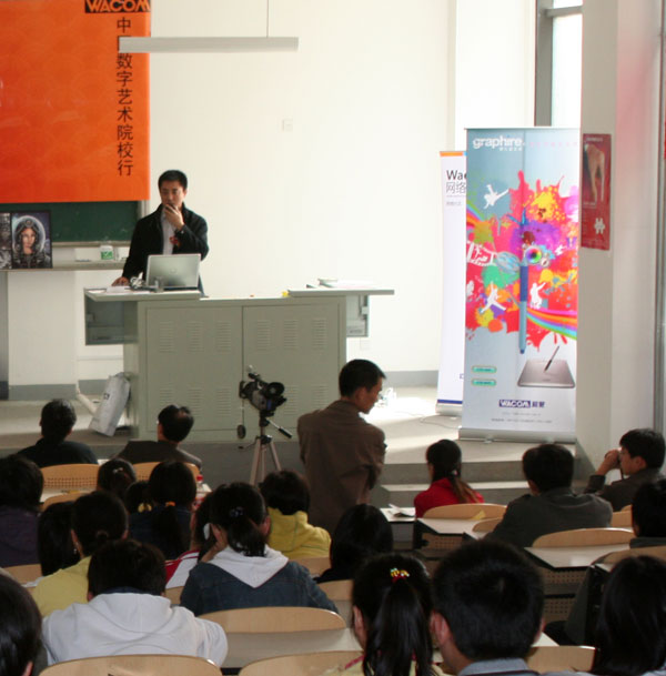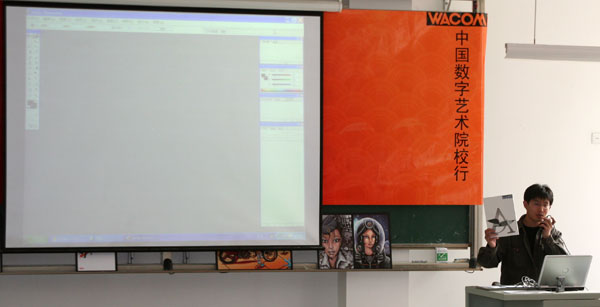 山东工艺美院教师惠岩、Wacom产品专家张予分别通过生动的实例详细讲解了Illustrator等软件同Wacom手写板的结合使用,使在场同学更好地了解Wacom手写板的强大功能和具体的操作技巧。讲座期间,还穿插进行了有奖问答的活动,使得同学们在轻松愉悦的氛围中加深了对Wacom产品的了解。