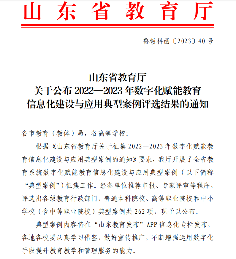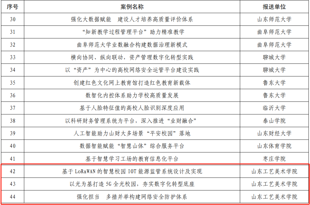近日,山东省教育厅公布了2022-2023年数字化赋能教育信息化建设与应用典型案例评选结果,我校报送的《基于LoRaWAN的智慧校园IOT能源监管系统设计及实现》《以光为基打造5G全光校园,夯实数字化转型底座》《强化担当 多措并举构建网络安全防护体系》三项应用成果全部成功入选。