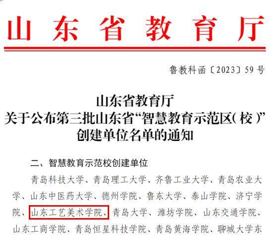 近年来,学校以习近平新时代中国特色社会主义思想为指导,全面贯彻党的教育方针,落实立德树人根本任务,大力推动新一代信息技术与教育教学、管理服务的深度融合,持续推进智慧“教与学”。建成省内首家全运营商接入“5G+WiFi6”融合全光承载网和400㎡模块化云计算数据中心,建有 “设计人工智能”计算平台,有效支撑影视、游戏、数媒等专业智能设计创作与研究;实现了学校OA、教务、科研等31个业务系统的互联互通和高效共享,一体化门户、统一身份、统一消息、统一支付、流程引擎、企微移动端等公共服务平台得到全面应用;建有12间适合多种场景的智慧教室、62间互动轻智慧教室,长江雨课堂等智慧教学工具并在日常教学中广泛应用,36门在线开放课程上线国家智慧教育平台,56门课程实现在智慧树、山东省课程联盟等多个平台上线运行,《专产协作 项目协助 课程协力:应用型高校设计类专业协同育人新模式》获批山东省第九届高等教育教学成果一等奖,“产品设计人才培养模式改革”入选首批国家级虚拟教研室建设试点项目。
