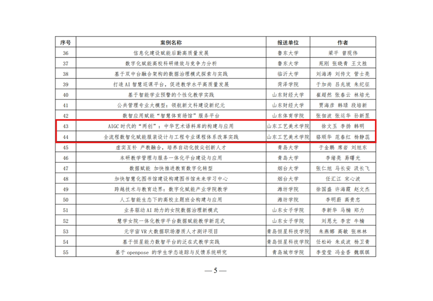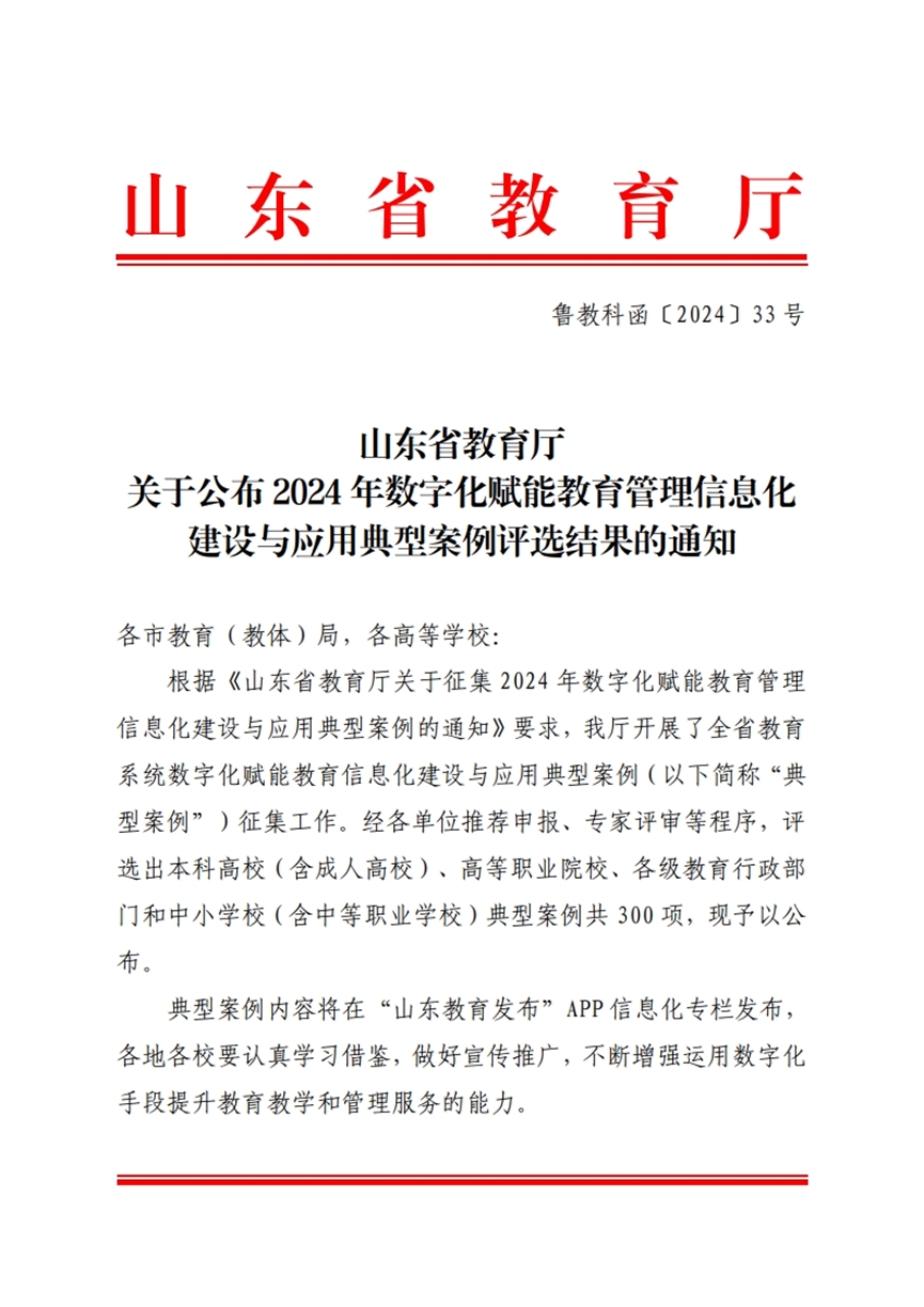 7月27日,山东省教育厅发布《关于公布2024年数字化赋能教育管理信息化建设与应用典型案例评选结果的通知》(鲁教科函〔2024〕33号),我校组织报送的2项案例全部入选。