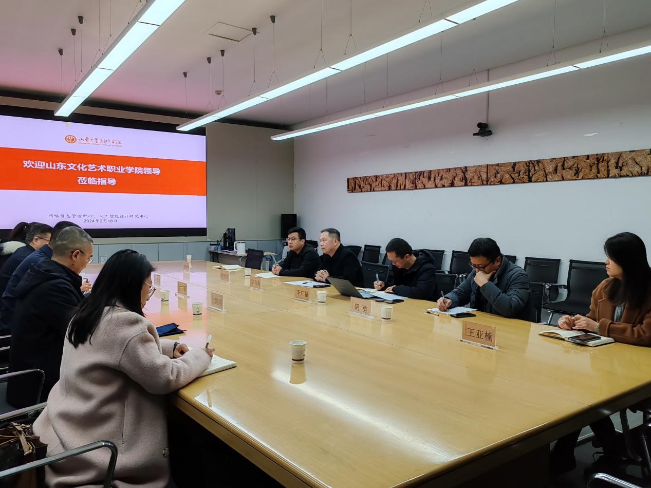 2月18日,山东文化艺术职业学院副院长王萌、纪委书记胡学林一行五人来访我校,就信息化建设、人工智能教育应用等事项展开深入交流,我校组织部部长、党委(学院)办公室主任弭友海接待来宾并主持座谈会,教务处、网络信息管理中心、人工智能设计研究中心相关负责人参会并汇报交流。