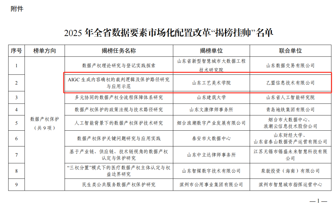 近日,山东省大数据局公布了2025年山东省数据要素市场化配置改革“揭榜挂帅”名单,我校提交的《AIGC 生成内容确权的裁判逻辑及保护路径研究与应用示范》以其创新性和实用性成功入选。此活动旨在加快推进数据要素市场化配置改革,加速培育数据市场,充分释放数据要素价值,全省共提交217个项目,经过层层筛选,77个项目脱颖而出。