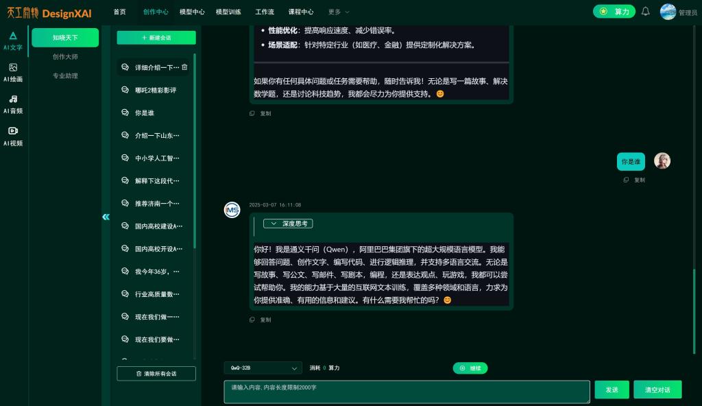 QwQ-32B是阿里通义千问团队推出的开源推理模型,它通过持续扩展强化学习训练的规模,实现了与巨型混合专家模型(MoE)相媲美的性能,这款仅有320亿参数的模型在性能上不仅能够比肩拥有6710亿参数的DeepSeek-R1,更在某些测试中超越了DeepSeek-R1;“天工开物”大模型服务平台是一个以生成式人工智能(AIGC)技术为核心,专注于为师生提供设计艺术AI拓展学习的教学实训平台。平台提供课程中心、模型中心、赛事中心、作品中心、新闻资讯、个人中心等核心功能,集成大语言模型、文生图模型、音乐生成模型及视频生成模型等主流AI工具,并整合ComfyUI设计工作流、ControlNet可控生成、LoRA模型训练等高级创作功能,通过组织一系列富有创新性和实践性的教学活动,让师生有机会深入了解人工智能的基本原理,熟练掌握其关键技术,并探索其在设计行业中的应用可能性。