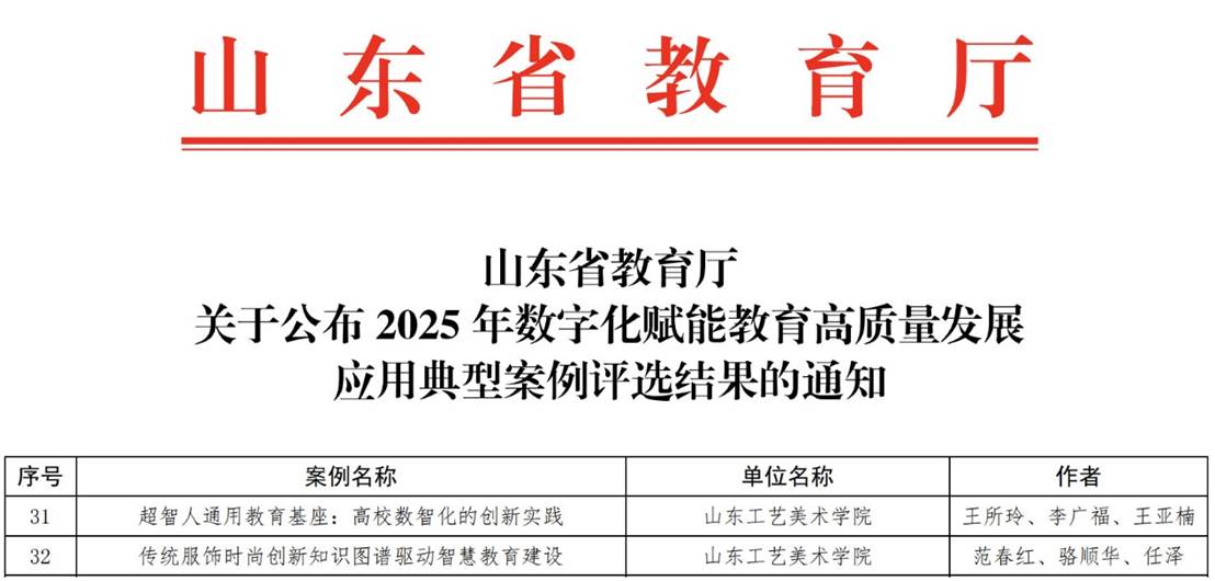 近年来,学校积极响应国家战略,在全国艺术类院校中率先系统谋划与全面布局,以学科交叉、产教融合为切入点,将人工智能技术全方位融入设计教育全环节,取得丰硕成果。此次两项案例的成功入选,是对我校在数字化教育领域探索与实践的高度认可。未来,我校将持续深化教育数字化改革,拓展人工智能技术在教育场景中的应用广度与深度,为培养适应数字时代的复合型设计人才作出更大贡献。