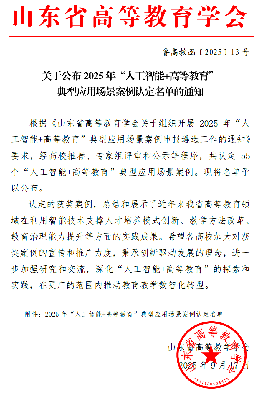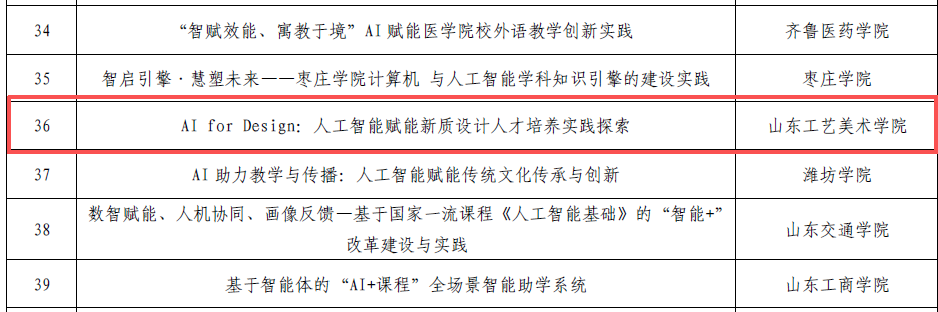 近日,山东省高等教育学会发布2025年“人工智能+高等教育”典型应用场景案例遴选结果。经高校推荐、专家评审等严格程序,我校申报的《AI for Design:人工智能赋能新质设计人才培养实践探索》项目成功入选。