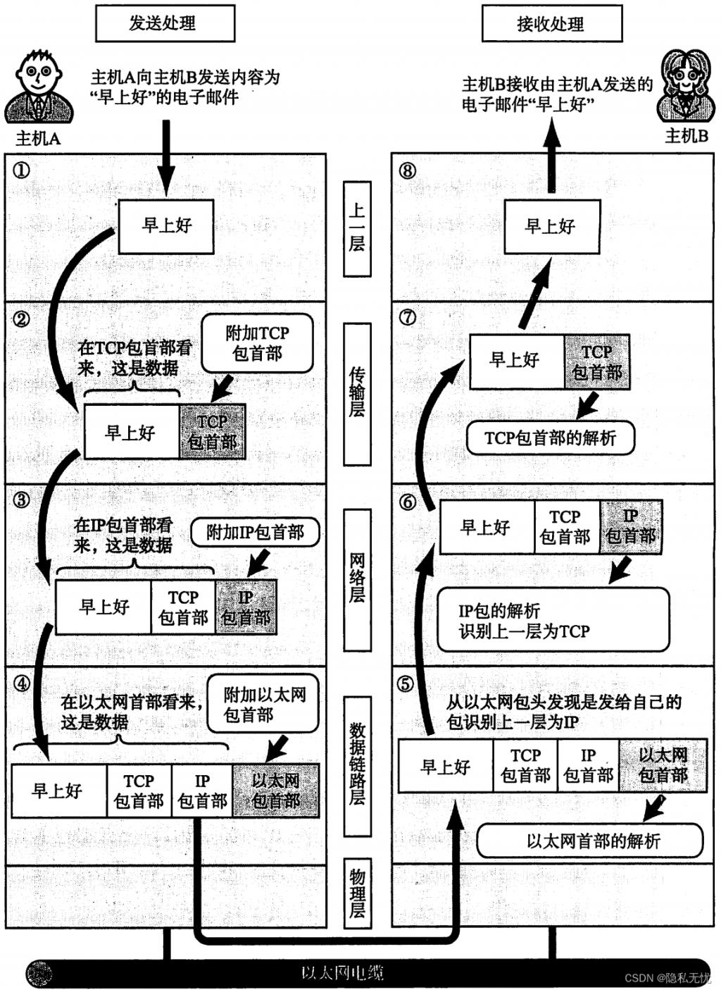 每个分层中,都会对所发送的数据附加一个首部,在这个首部中包含了该层必要的信息,如发送的目标地址以及协议相关信息,明确标明了协议应该如何读取数据。首部的结构由协议的具体规范详细定义。